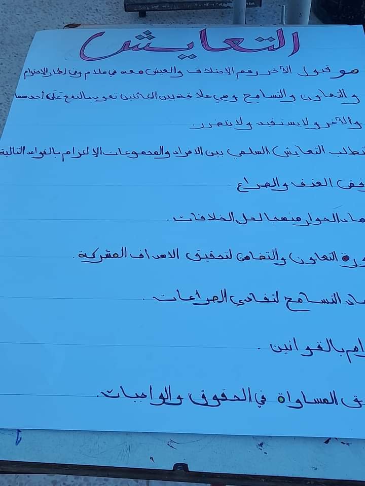 تعريف التعايش..بخط التلميذة المتميزة تسنيم بالصغير عضوة ورشة الطفل الأديب التابعة لمجلس الكتاب والادباء والمثقفين نشرت بواسطة: Samya altarabehe في صورة وخبر 22 ديسمبر، 2022 0 969 زيارة تعريف التعايش محور عملنا الورشي بخط تلميذتي المتميزة تسنيم بالصغيرعضوة ورشة الطفل الأديب التابعة لمجلس الكتاب والادباء والمثقفين العرب 2022-12-22 Samya altarabehe tweet