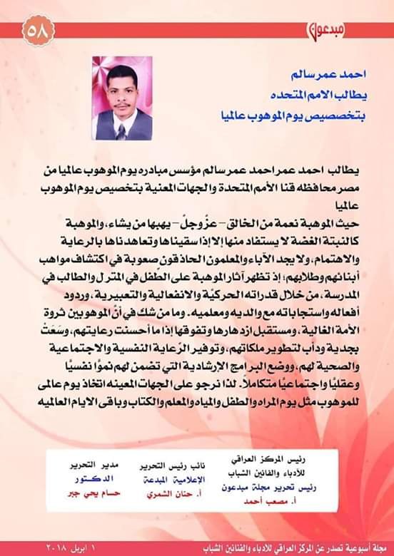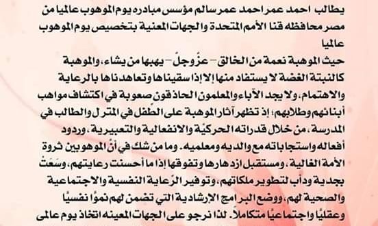 أحمد عمر سالم يطالب هيئة الأمم المتحدة نشرت بواسطة: Samya altarabehe في أخبار عربية 28 يناير، 2019 0 1,889 زيارة أحمد عمر سالم يطالب هيئة الأمم المتحدة بتخصيص يوم عالمى بالموهوب عالمياً 2019-01-28 Samya altarabehe tweet
