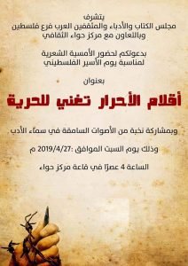 أمسية شعرية لمجلس الكتاب والادباء والمثقفين العرب ” فرع فلسطين ” بالتعاون مع مركز حواء الثقافي الدعوة عامة
