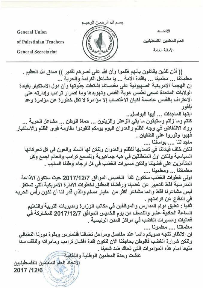 الاتحاد العام للمعلمين الفلسطينيين يدعو الى تعليق الدراسة للمشاركة في مسيرات الغضب نشرت بواسطة: YASMEN ALSHAM في آخر الأخبار, أخبار دولية 6 ديسمبر، 2017 0 1,172 زيارة القدس خط احمرلنخرج في مسيرات الغضب غدا الساعه ١١:٣٠ معلمين وطلبة وموظفين ونعلن بأن #القدس خط احمر .#للنشر_والتعميم 2017-12-06 YASMEN ALSHAM tweet