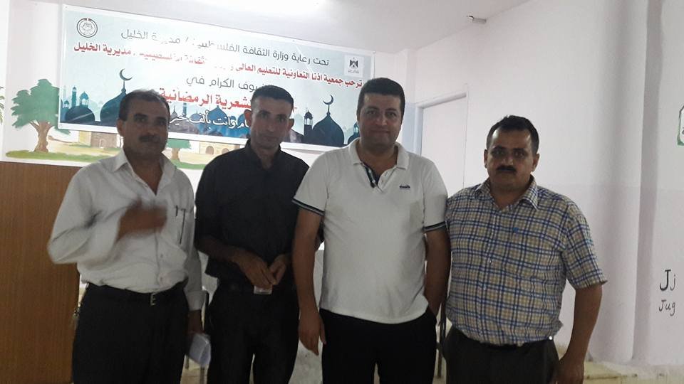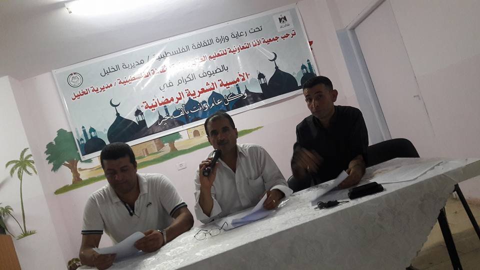 الشاعر صلاح الطميزي عضو مجلس الكتاب والادباء والمثقفين العرب يشارك بأمسية تحت رعاية وزارة الثقافة الفلسطينية / الخليل أقامت جمعية اذنا التعاونية للتعليم العالي يوم امس السبت حيث نقل الاستاذ صلاح الطميزي تبريكات سيادة رئيس مجلس الكتاب العرب الشريف د.جهاد ابومحفوظ للحضور بقرب حلول عيد الفطر السعيد