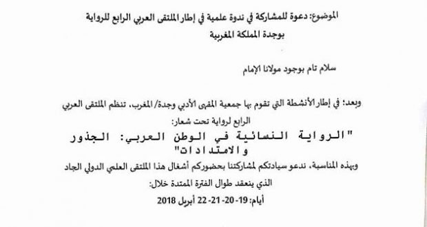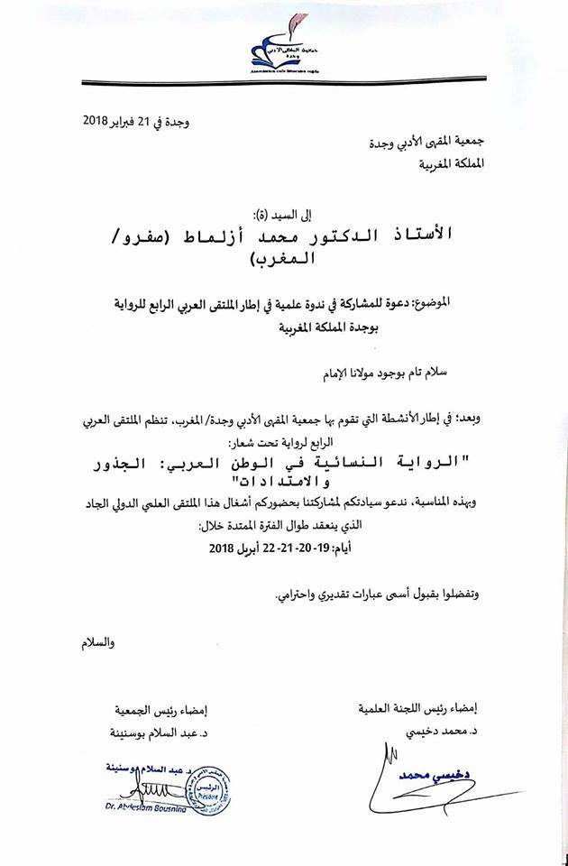 تلقى الأستاذ الدكتور محمد أزلماط دعوة رسمية للمشاركة في ندوة علمية في إطار الأنشطة التي تقوم بها جمعية المقهى الأدبي في وجدة / المغرب .