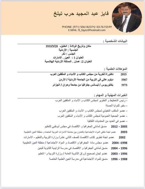 السيرة الذاتية لعضو المكتب التنفيذي رئيس لجنة التخطيط والتطوير ” د- فايز تيلخ نشرت بواسطة: Samya altarabehe في أخبار المجلس 19 نوفمبر، 2020 0 1,049 زيارة السيرة الذاتية لعضو المكتب التنفيذي رئيس لجنة التخطيط والتطوير بمجلس الكتاب والادباء والمثقفين العرب ” د- فايز تيلخ “ 2020-11-19 Samya altarabehe tweet