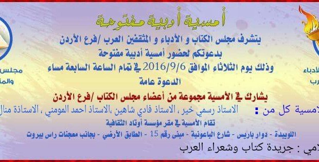 يتشرف مجلس الكتاب والأدباء والمثقفين العرب-فرع الأردن بإقامة أمسية أدبيةمفتوحة يشارك فيها بعض اعضاء المجلس حيث يشارك كل من: