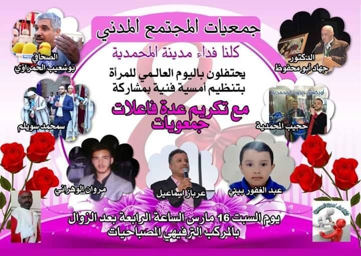 تحت شعار كلنا فداء لمدينة المحمدية احتفلت جمعيات المجتمع المدني باليوم العالمي للمرأة نشرت بواسطة: samira mahassine في أخبار المجلس 16 مارس، 2019 0 1,517 زيارة تحت شعار كلنا فداء لمدينة المحمدية احتفلت جمعيات المجتمع المدني باليوم العالمي للمرأة وبتنظيم أمسية فنية مع تكريم عدد من فاعلات الجمعويات بمشاركة : د. الشاعر – جهاد أبو محفوظ رئيس مجلس الكتاب والادباء والمثقفين العرب حجيب المحمدية الصحافي بوشعيب الحمراوي سمحمد سويلم عبد الغفور بيني عرباز اسماعيل مروان الوهراني وذلك يوم السبت 16 مارس على الساعة الرابعة زوالا بالمركب الترفيهي الصباحيات 2019-03-16 samira mahassine tweet
