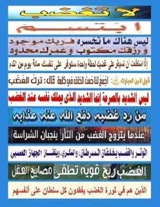 – ان الغضب أمر من طبيعة النفس . لكنه مدمر وصفة سلبية وخلق ذميم ونزغة من نزغات الشيطان . يفقدك التعاطف وحسن التدبير والتفكير . فكن صبورا وتحكم فى مشاعرك حتى لا تحدث كارثة على صحتك . عندها تستهلك طاقتك العصبية وتتهيج الأوعية الدموية ويحدث لك ارتفاع الضغط وجلطة وزيادة ضربات القلب وسكتة قلبية وتسارع معدل التنفس ومرض السكرى . والتهور والعصبية يؤدى انفصال الزوجين عن بعضهما ويحدث تفكك أسرى
