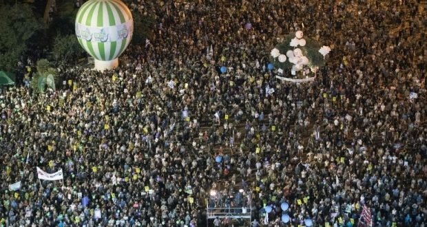 تظاهر عشرات الالاف من الاسرائيليين من أحزاب اليسار، وسط ميدان “رابين” في مدينة تل ابيب امس السبت، للمطالبة بتحقيق السلام على اساس دولتين لشعبين، تحت شعار “دولتان- أمل واحد”.