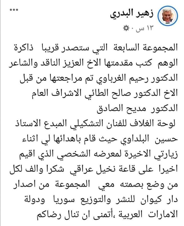 تهنئه باسم المجلس للأديب الأستاذ زهير البدري ممثل مجلس الكتاب والأدباء والمثقفين العرب في العراق على منجزه السابع نشرت بواسطة: Samya altarabehe في آخر الأخبار, أخبار المجلس 26 نوفمبر، 2022 0 591 زيارة كل التبريكات لاخي الكبير الاستاذ زهير البدري منجزه الجديد واختياره احد أعمالي صورةً للغلاف 2022-11-26 Samya altarabehe tweet