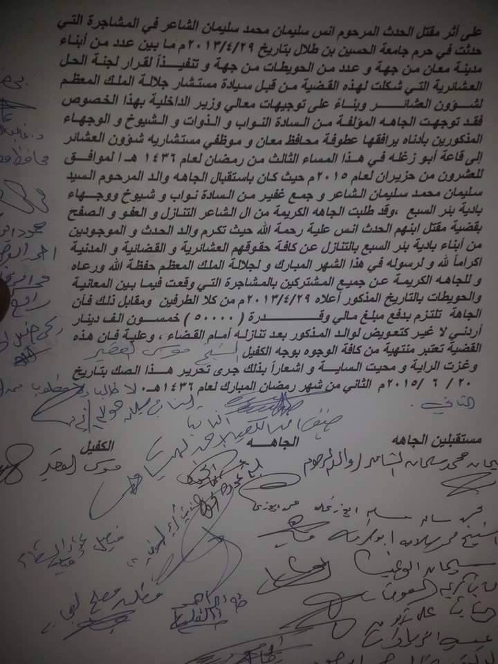 عمان – توجهت جاهة صلح بين المعانية وعشيرة الشاعر من أبناء قبائل وعشائر بئر السبع برئاسة الشيخ ضيف الله كعيبر مساء اليوم السبت 20/6/2015م في قاعات رجال الأعمال في مطاعم أبو زغلة /الطيبة , وضمت الجاهة عدد كبير من الوجهاء والنواب والأعيان وكان في استقبالها وفد من جمعية بئر السبع الثقافية وجمع من شيوخ وكبار ووجهاء قبائل بدو بئر السبع وذلك على أثر مقتل الطفل أنس الشاعر عام 2013م في أحداث جامعة الحسين .