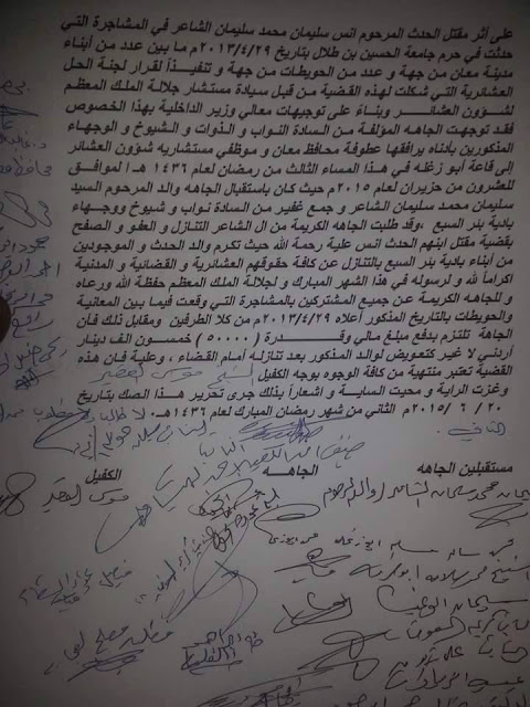 وبعد التداول في قضية الطفل المغدور أنس الشاعر تم الاتفاق على عدة أمور , وبناء على ذلك تكرم ذوو المجني عليه باحتساب ابنهم شهيدا في سبيل الله والوطن.