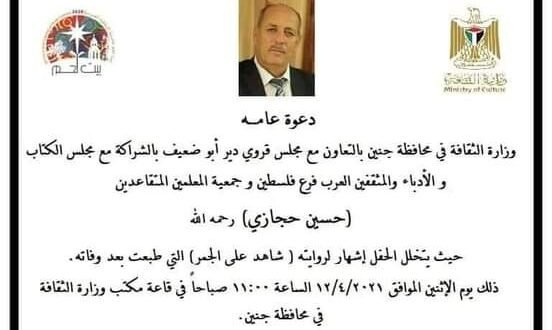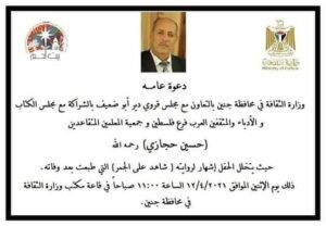 دعوة عامة وزارة الثقافة في محافظة جنين بالتعاون مع مجلس قروي دير ابو ضعيف بالشراكة مع مجلس الكتاب والادباء والمثقفين العرب فرع فلسطين