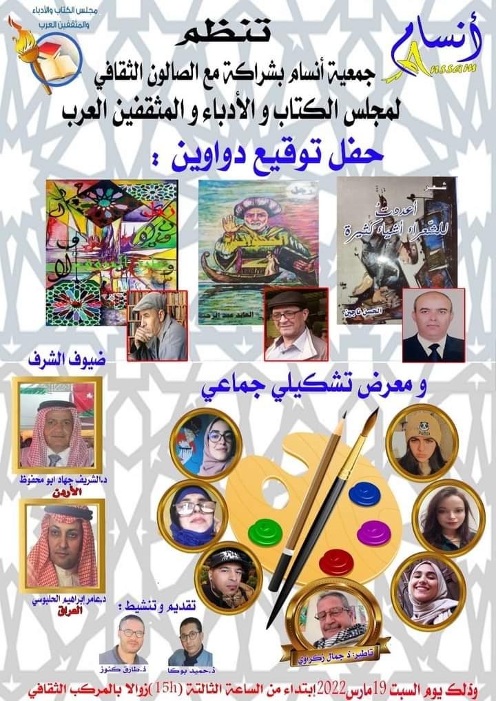 أجواء ستظل في الذاكرة ، خلفها الحدث الثقافي الكبير الذي جمع بين جمعية أنسام ، والصالون الثقافي لمجلس الكتاب والأدباء والمثقفين العرب ، بالمركب الثقافي الفقيه بن صالح ، والذي حضرته عدة نجوم لامعة في سماء الأدب والفن ، من المغرب وبلدان عربية أخرى كالأردن وتونس والمملكة العربية السعودية ، فشكراً للشريف الدكتور جهاد أبو محفوظ الذي يبذل قصارى جهده منذ أن وطأت قدماه هذا الوطن من أجل نشر الثقافة واكتشاف المواهب ودعمهم كذلك… شكراً لكل من ساهم من قريب أو بعيد في إنجاح هذا العرس الثقافي الفني الرائع ، الذي ألف بين القلوب وجمع شمل الثقافة العربية في لمة سادها جو الأخوة والمحبة،…. شكراً مرة أخرى للسيد عبد الله وقاص باشا المدينة ، الذي حضر الحدث من بدايته إلى نهايته ، شكراً لجميع فعاليات ومكونات مدينة الفقيه بن صالح الجميلة.