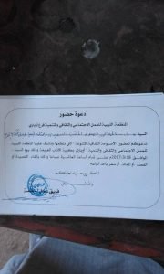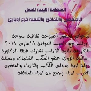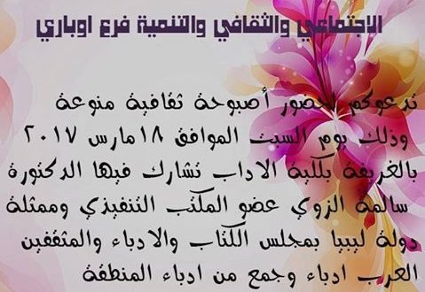 تتشرف المنظمة الليبية للعمل الاجتماعي والثقافي والتنمية فرع اوباري بدعوة عضوة المكتب التنفيذي بمجلس الكتاب والادباء والمثقفين العرب الدكتورة الاعلامية سالمة الزوي ممثلة المجلس فرع ليبيا برئاسة سيادة الشريف دكتور جهاد ابو محفوظ للمشاركة بالمهرجان الذي تقيمه المنظمة من خلال اصبوحة ثقافية متنوعة تنظمها وتشرف عليها المنظمة وذلك يوم السبت الموافق 18 /3/ 2017على تمام الساعة العاشرة بمقر كلية الاداب بالغريفة ,شاكرين للمجلس تلبية الدعوة بالحضور .