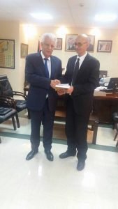 استقبل سعادة سفير دولة فلسطين السيد جمال الشويكي بمكتبه بالرباط يوم الاربعاء 7مارس من السنة الجاريةكل من الأستاذ عبد العزيز تقي رئيس اللجنة الثقافية بالجماعة الترابية صفرو و الأستاذ عبد الحق شاكر عضو بالجماعة الترابية صفرو وعن مجلس الكتاب والمثقفين والادباء العرب السيد د- جهاد ابومحفوظ رئيس مجلس الكتاب والادباء والمثقفين العرب وسعادة د- محمد ازلماط نائب الرئيس التنفيذي لمجلس الكتاب والادباء والمثقفين العرب وتتمحور الاجتماع حول مشاركة دولة فلسطين كضيف شرف بالملتقى الثقافي المزمع تنظيمه بمدينة صفرو بتاريخ 26-27-28 أبريل 2018في دورته 29 الذي ينظمه مجلس جماعة صفرو بتنسيق مع مجلس الكتاب والادباء والمثقفين العرب. وبعد ذلك قدم د- محمد ازلماط بعض من مؤلفاته اهداء لسعادة السفير الذي شرفنا بحسن استقباله وابتسامته التي لاتفارق محياه