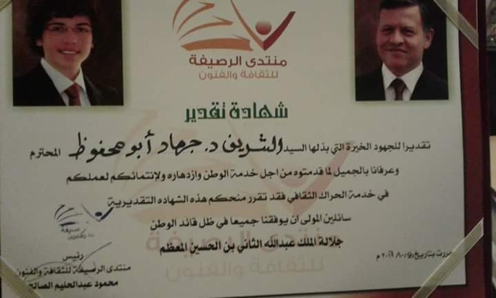 من منتدى الرصيفة للثقافة والفنون ممثلة برئيسه الاستاذ محمود الصالح