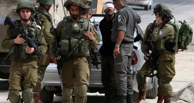 TOPSHOT - Israeli security forces arrest a Palestinian man after he allegedley threw stones at an Israeli settler's car in the West Bank village of Hawara on April 5, 2016. Two Palestinians were arrested in a search operation following the incident. / AFP / JAAFAR ASHTIYEH (Photo credit should read JAAFAR ASHTIYEH/AFP/Getty Images)