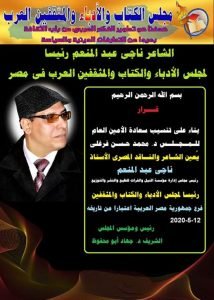 رئيس مجلس ادارة مؤسسة النيل والفرات للنشر والتوزيع ” رئيسا لمجلس الكتاب والادباء والمثقفين فرع جمهورية مصر العربية اعتبارا من تاريخه