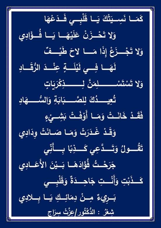 كَمَا نَسِيَتْكَ يَا قَلْبِي…بقلم الشاعر عزت سراج نشرت بواسطة: Samya altarabehe في أدب الكتاب 27 مايو، 2020 0 695 زيارة من شعري القديم في مرحلة الصبا ( كَمَا نَسِيَتْكَ يَا قَلْبِي) 2020-05-27 Samya altarabehe tweet