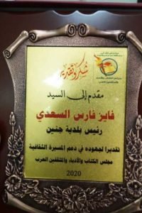 مجلس الكتاب والأدباء والمثقفين العرب فرع فلسطين في اتفاقية تعاون مع بلدية جنين. استقبل رئيس بلدية جنين السيد فايز السعدي وفد مجلس الكتاب والأدباء والمثقفين العرب والذي ضم كل من رئيس المجلس أنور الزبن ونائب الرئيس نسيم قبها والعضو محمد الأخرس. وكان الأستاذ نسيم قبها قد استهل اللقاء بتعريف رئيس البلدية حول نشاطات المجلس وأهمية جنين كمحافظة تحوي مخزونا ثقافيا هائلا في فلسطين ، ما يعني التعاون بين البلدية والمجلس لتهيئة الواقع الثقافي لنشاطات عديدة. بدوره شكر السيد أنور الزبن لرئيس البلدية تجاوبه الرائع في اثراء الحالة الثقافية الأمر الذي أكده محمد الأخرس. وكان السيد فايز السعدي قد شكر المجلس على جهوده المعطاءة ، معبرا عن استعداد البلدية للتعاون الدائم مع المجلس. وفي نهاية اللقاء تم تسليم بلدية جنين درع المجلس كفاتحة ثقافية فاعلة في المستقبل.