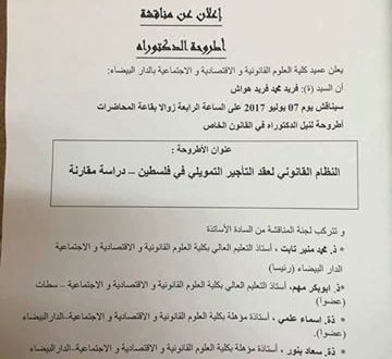 مجلس الكتاب والادباء والمثقفين العرب ورئيسه المؤسس الشريف د.جهاد ابومحفوظ يهنئؤون الدكتور المحامي فريد هواش من فلسطين لحصولة على درجة الدكتوراة بالقانون الخاص ..عنوان أطروحته النظام القانوني لعقد التأجير التمويلي في فلسطين – دراسة مقارنة، من جامعة الحسن الثاني _ كلية العلوم القانونية والاقتصادية والاجتماعية – الدار البيضاء