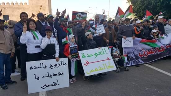 وقد شارك بهذة المسيرة عدد من الاحزاب السياسية والهيئات النقابية والحقوقية والجمعوية وعشرات الالاف من المواطنين من داخل الرباط ومن المدن المغربية الاخرى وفدوا للرباط للمشاركة بهذة المسيرة لمساندة الشعب الفلسطيني ضد دولة الاستيطان ورفع المشاركون لافتات حملت شعارات رافضة لصفقة القرن معلنين تضامنهم التام مع القضية الفلسطينية متشبثين بان القدس عربية وستبقى عاصمة فلسطين الابدية