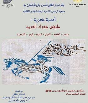 تتشرف رئيسة جمعية نرجس للتنمية الاجتماعية والثقافية بتنسيق مع المركز الثقافي المصري بالرباط بدعوتكم لحضور امسية شعرية تحث شعار ملتقى شعراء العرب وذلك يوم الخميس 3مارس 2016على الساعة السادسة مساءا بالمركز الثقافي المصري بمدينة الرباط مرحبا بكل الاصدقاء