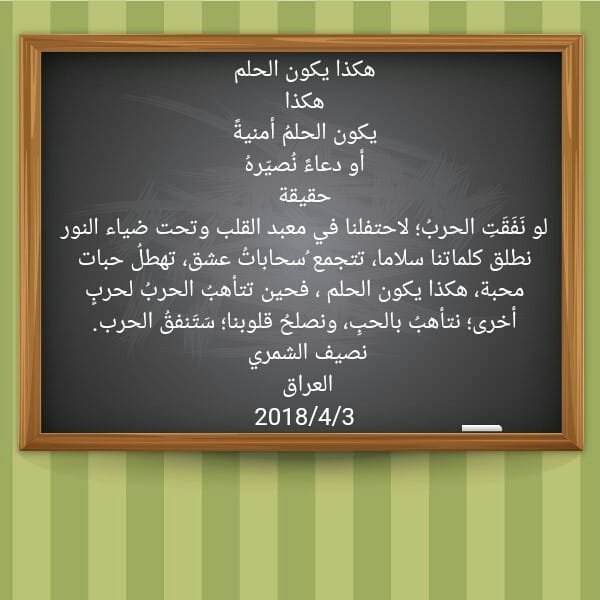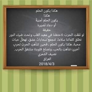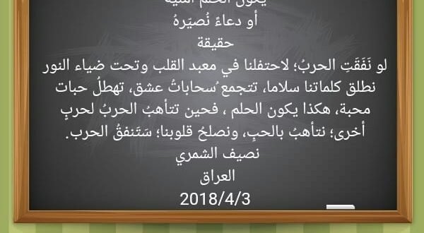 لو نَفَقَتِ الحربُ؛ لاحتفلنا في معبد القلب وتحت ضياء النور نطلق كلماتنا سلاما، تتجمع ُسحاباتُ عشق، تهطلُ حبات محبة، هكذا يكون الحلم ، فحين تتأهبُ الحربُ لحربٍ أخرى؛ نتأهبُ بالحبِ، ونصلحُ قلوبنا؛ سَتَنفقُ الحرب.