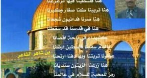 ***هنا القدس عاصمتنا*** هنا فلسطينا فيها ترعرعنا هنا تربينا كنا صغار وكبرنا هنا صرنا فدائيون شجعانا هنا في قدسنا قد سقطنا كشهداء في باحة اقصانا بالدم سقينا فلسطين ارضنا عطرنا تربتنا وبها دفنا ارتحنا هنا زرعنا الزيتون سنديانا رمز للمحبة للسلام في عالمنا هنا ضحكنا ...