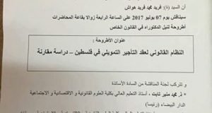 بسم الله الرخمن الرحيم مجلس الكتاب والادباء والمثقفين العرب ورئيسه المؤسس الشريف د.جهاد ابومحفوظ يهنئؤون الدكتور المحامي فريد هواش من فلسطين لحصولة على درجة الدكتوراة بالقانون الخاص ..عنوان أطروحته النظام القانوني لعقد التأجير التمويلي في فلسطين – دراسة مقارنة، من جامعة الحسن الثاني _ كلية ...