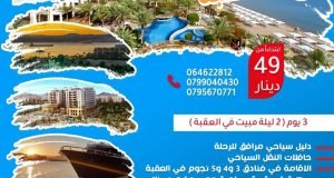 رحلات سياحية داخلية بالاردن – عرض خاص رحلات ثاني وثالث ايام العيد 2 يوم ( 1 ليلة ) مبيت عقبة ابتداءا من 29 دينار جولة بحرية ساعة ونصف ( هدية من الشركة ) زيارة محطة العلوم البحرية زيارة الشاطئ الجنوبي وقت حر للتسوق ــــــــــــــــــــــــــــــــــــــــــ 3 ...