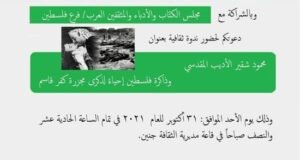 يسر بيت الفكر والثقافة الشبابي وبالشراكة مع مجلس الكتاب والأدباء والمثقفين العرب دعوتكم لحضور ندوة ثقافية محمود شقير الأديب المقدسي بعنوان وذاكرة فلسطين إحياء لذكرى مجزرة كفر قاسم وذلك يوم الأحد الموافق : 31 أكتوبر للعام 2021 في تمام الساعة الحادية عشر والنصف صباحاً في ...