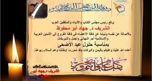 يرفع مؤسس و رئيس مجلس الكتاب والأدباء والمثقفين العرب الشريف د. جهاد أبو محفوظ بالأصالة عن نفسه ونيابة عن كافة الأعضاء في كافة الفروع إلى الأمتين العربية والإسلامية أحر التهاني وأجمل والتبريكات بمناسبة حلول عيد الأضحى أعاده الله علينا وعليكم باليمن والبركات وقد تحررت أوطاننا ...