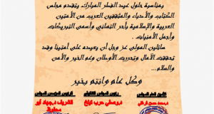 بمناسبة حلول عيد الفطر المبارك يتقدم مجلس الكتاب والأدباء والمثقفين العرب من الأمتين العربية والإسلامية بأحر التهاني وأسمى التبريكات وأجمل الأمنيات .