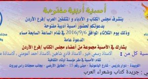 امسية ادبية مفتوحة لمجلس الكتاب والادباء والمثقفين العرب فرع الاردن يتشرف مجلس الكتاب والأدباء والمثقفين العرب-فرع الأردن بإقامة أمسية أدبيةمفتوحة يشارك فيها بعض اعضاء المجلس حيث يشارك كل من: الاستاذ رسمي خير الاستاذ فادي شاهين الاستاذ احمد المومني الاستاذة منال الحزام واخرون وذلك في تمام ...